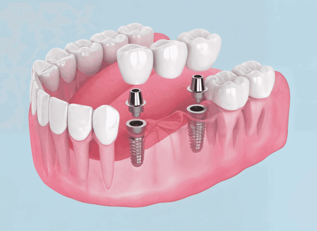 When 2 or more teeth are missing next to each other, an implant bridge can be used. This is when a titanium implant is placed at each end of the missing row of teeth, and an implant bridge is fixed to replace the necessary number of teeth.